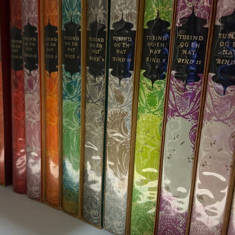 Bogen om tusind og én nat 1-12, komplet, Diverse, genre: eventyr, Pæn privatindbinding. Fischers Forlag 1947-1951. 24 dele i 12 bind. Smudsomslag med vignet af Bjørn Wiinblad medindbundet.