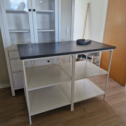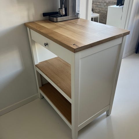 Kan bruges i det lille køkken som ekstra bordplads/opbevaring. Er i god stand med få brugsspor. Den har en skruehul i (har været brugt til ovnhandske).