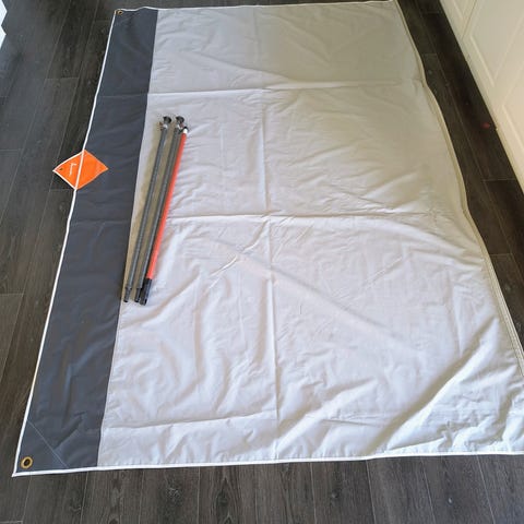 Reimo Como 4 solsejl grå farve. Leveres med stænger, pløkker og opbevaringspose som vist på billederne. Egnet til camping og udendørs brug, hvor der er behov for lidt ekstra skygge Er en del af Reimos Tent Technology-serie med modelnummer 90023 Como 4 Grey.
