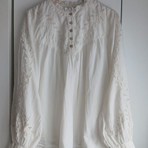Fransa bluse til kvinder i størrelse L (Brystmål ca. 116 cm) Blusen er hvid og fremstillet i bomuld. Modellen har gennemknapning foran og elastik ved ærmekanter. Ærmerne er trekvartlange med broderie anglaise-lignende hulmønster, som giver et let og luftigt udtryk. Velegnet til hverdagsbrug eller mere pæne anledninger afhængigt af styling.