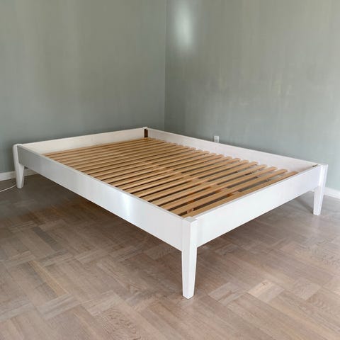 Med lamelbund i hvid. Sengen består af en rektangulær ramme med integreret lamelbund i træ. Sengen står på diskrete ben, som giver luft under rammen og gør det nemmere at rengøre gulvet.