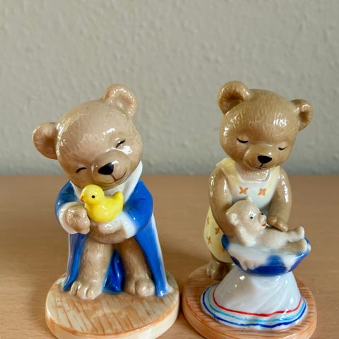 1998 Victor og Victoria. Sættet består af to stående bamser på små runde sokler, hvor den ene bærer hat og taske, og den anden er klædt i jakke og holder en hat.
