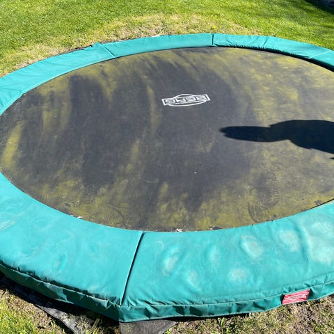 Med sikkerhedsnet og stige- i fin stand. Desværre ikke brugt ret meget. Dug og kantmåtte opbevaret indenfor om vinteren. Det er kabelstrips der stikker op, for at forhindre at duer sidder der. Kan tages af igen, men det virker.