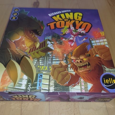 IELLO King of Tokyo brætspil. Strategisk terning- og monsterkamp-spil, hvor spillerne styrer hver deres monster og kæmper om kontrollen over Tokyo. Spillet indeholder spilleplade med Tokyo, terninger, energiterninger, kort, pap-figurer med tilhørende standere samt diverse markører. For 2-6 spillere, spilletid ca. 30 minutter. Egnet til familie- og selskabsspil.