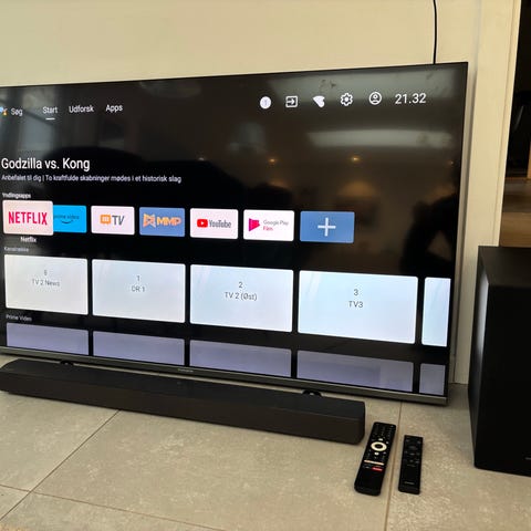 Philips tv med fjernbetjening. Tv’et viser smart-tv funktioner som adgang til bl.a. Netflix, YouTube og andre streamingtjenester via menulinjen på skærmen. Fjernbetjeningen har dedikerede knapper til udvalgte apps samt Ambilight-knap.