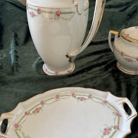 Porcelæn stel i hvid med blomstermotiv og guldkant. Sættet omfatter forskellige fade, tallerkener, kander og lysestager i samme dekoration. Stellet er egnet til servering af både hverdag og mere formelle måltider og kan bruges som samlet middagsstel eller som supplement til andet hvidt porcelæn med guldkant. 20 dybe og 20 flade tallerkener, mange fade, lysestager mv.
