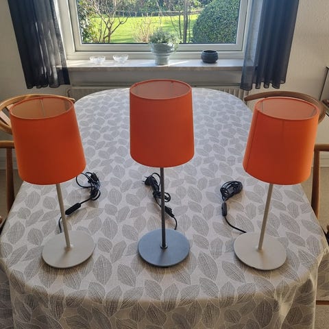 IKEA Asmussen bordlampe med hvid lampeskærm og messingfarvet fod. Lampen har en rund fod og en dekorativ stander med dråbeformede elementer. Velegnet som belysning på bord, skænk eller natbord i stue eller soveværelse. Bruger standard pære (se sokkeltype på selve lampen). Strømtilslutning via ledning med afbryder.