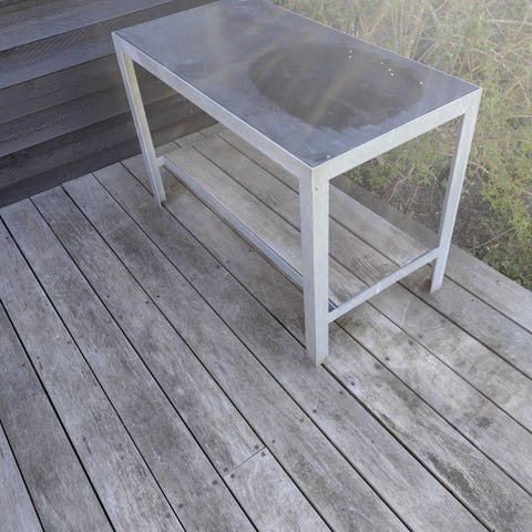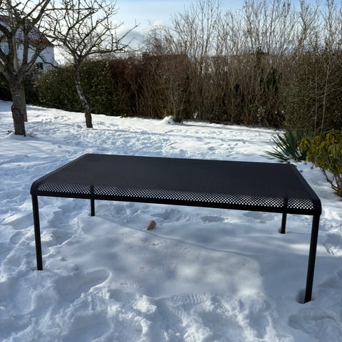 Ukendt brand rektangulært metalbord i galvaniseret stål. Bordet har gitterplade som bordplade og fire ben i metal. Egnet som havebord, plantebord eller arbejdsbord udendørs, hvor der ønskes et robust bord med gennemgående gitterplade, som kan tåle vind og vejr. Målene er 42 cm høj, 50 cm bred og 80 cm lang. Skal hentes for 75 kr.