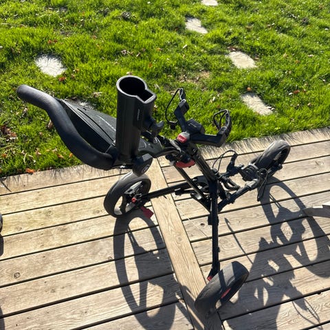 Bagboy golfvogn med tilhørende transporttaske i sort. Golfvognen er en trehjuls model, der kan klappes sammen for nem opbevaring og transport. Håndtaget har integrerede holdere, og der er kurv/rum under stellet til opbevaring af udstyr. Transporttasken er tilpasset vognen og har bærehank og lynlås, så vognen kan pakkes ned og bæres eller opbevares beskyttet.