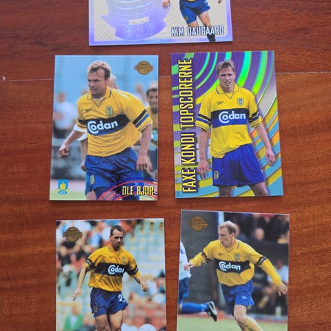 Brøndby fodboldkort. Flere samlekort med spillere fra Brøndby, med statistik og spilleroplysninger på bagsiden. Egnet til samlere af fodboldkort og fans af Brøndby IF.