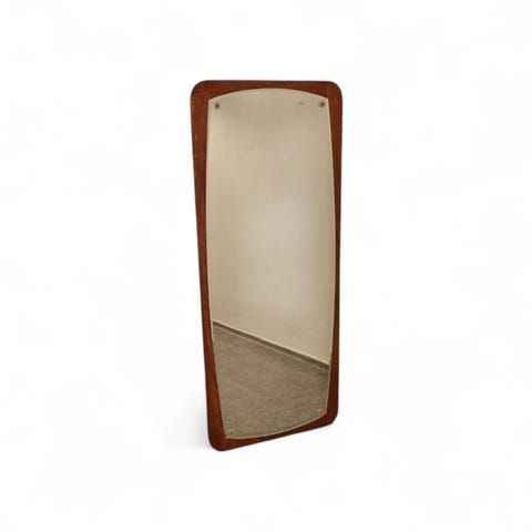 Meget fint spejl i teak. Fremstillet i 1960erne i Danmark. Spejlet er i stil med kai kristiansens fra aksel kjersgaard, smigsamlet og med falset kant. Smuk detalje med at rammen blivet tynd på midten - rigtig fin 60er stil.