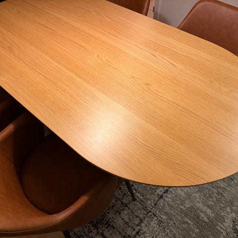 Dejligt spisebord med overflade i birke look og med flotte blanke stålben.