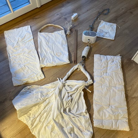 Velholdt slyngevugge fra Natures Sway med Membantu-motor. Vuggen er købt brugt, mens madras og afstivermadras er nye. Motoren kører upåklageligt.