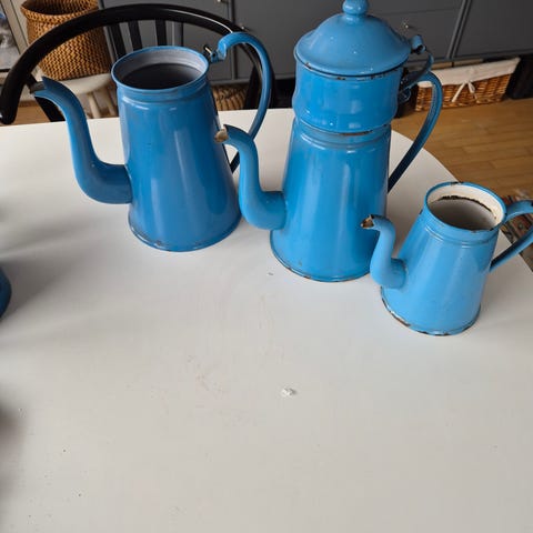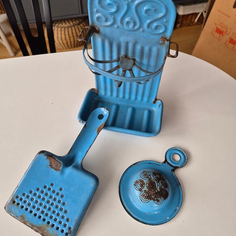 Sæt med emalje vægholdere og kop i blå. Sættet består af to vægholdere, hvoraf den ene er mærket "Sæbe", samt en lille kop. Emaljen er blå med hvid inderside på koppen. Velegnet som dekoration i køkken, bryggers eller badeværelse, eller til opbevaring af mindre genstande.