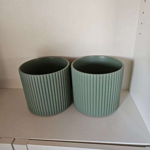 Forskellige urtepotteskjulere og små spande i forskellige størrelser og former. Sættet omfatter blandt andet større og mindre urtepotter i hvid, sort og lyserød samt små metalspande med hank. Egnede til indendørs brug til planter, opbevaring eller dekoration. Materialer omfatter både plast, metal og glas, som ses på billederne.