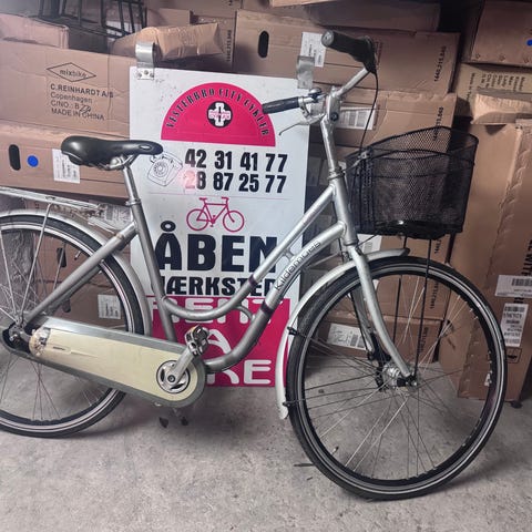Flot og klassisk damecykel fra Kildemoes i elegant grå/sort farve. Udstyret med 7 indvendige Shimano Nexus gear, som sikrer en jævn og pålidelig kørsel. Cyklen har bagagebærer og fastmonteret lys, hvilket gør den ideel til daglig transport.