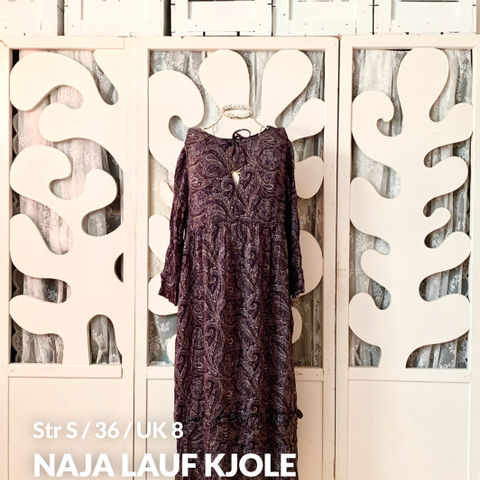Sommerkjole, Naja Lauf, str. L, Blåmønstret på hvid bund, Rayon, bomuld, God men brugt, En smuk sommerkjole med fine detaljer i halsudskæring med læg foran. Bagpå er der læg under bærestykket. Læggene giver en smuk vidde i kjolen, uden at det bliver for meget. Stoffet falder smukt. Længde 90 cm. Ærmer med kimonoskæring. Str 40.
