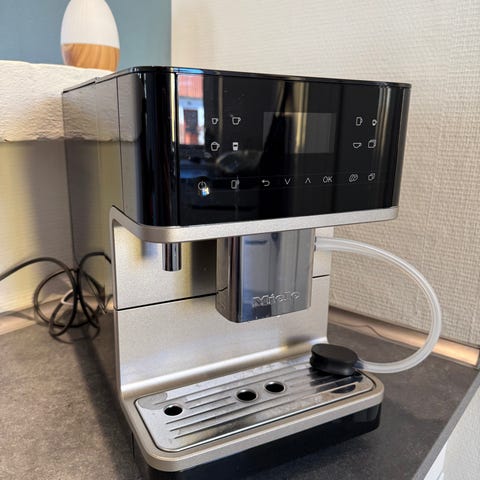 Maskinen har aftagelig drypbakke, damparm til opskumning af mælk og frontbetjening med drejeknapper og knapper til bryggefunktioner.