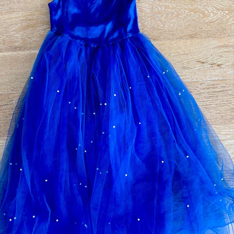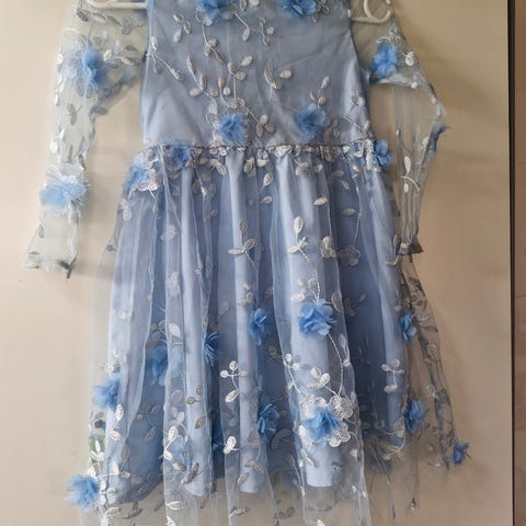 Velholdt pige tylkjole i lyseblå og hvid farve. Str. 140.