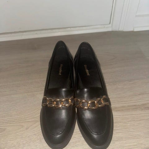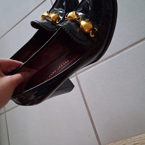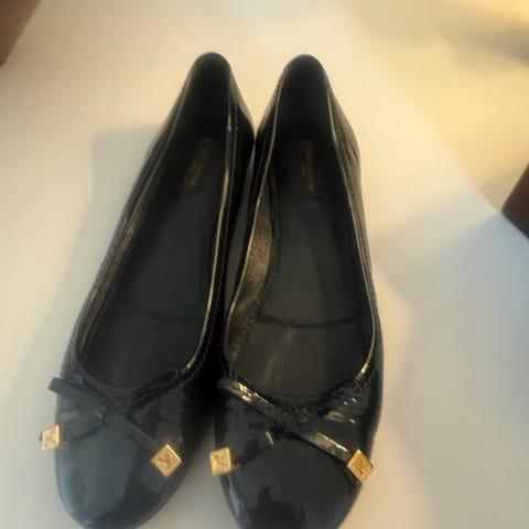 & Other Stories ballerina sko i str. 39. Modellen er i sort laklook med lav hæl og firkantet snude. Skoene har dekorative guldfarvede spænder foran og lys indersål. Velegnet som klassiske hverdagssko eller til pænere brug.
