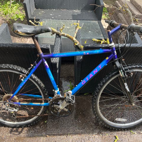 • Frame: Hand-cleaned vintage Giant Terrago (stunning pink/black marble paint).