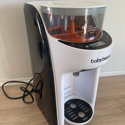 Baby Brezza flaskevarmer og mælkepulver-dispenser i hvid. Enheden er beregnet til tilberedning af modermælkserstatning i sutteflasker. Den har beholder til pulver, vandtank samt drypbakke foran. På toppen findes betjeningspanel med display og knapper til indstilling af mængde og funktioner. Maskinen tilsluttes med strømkabel på siden og er egnet til brug på bord eller kommode i køkken eller børneværelse.