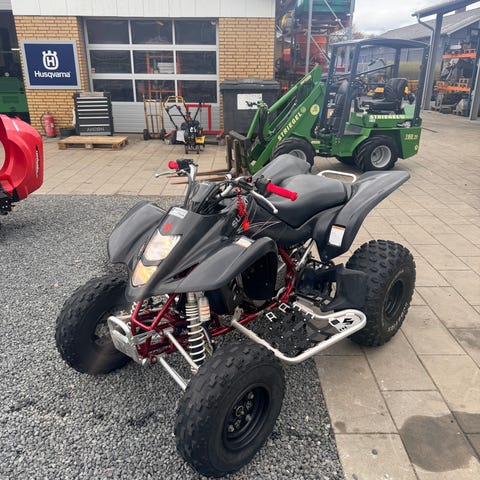 ATV 4-hjulet terrængående køretøj i grå farve. Modellen har brede terrændæk, for- og bagbagagebærer samt sæde til én person. Foran ses to lygter og en kofanger. Bagpå er der monteret træk med kuglekobling og tværbom, som kan bruges til at koble forskelligt udstyr eller en mindre trailer på. Køretøjet er egnet til kørsel på grus, mark eller andre ujævne underlag, f.eks. til arbejde omkring hus, have eller mindre landbrug.
