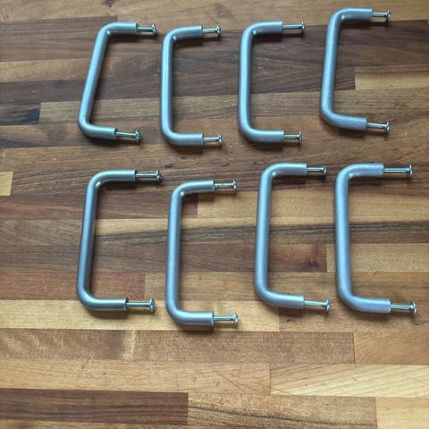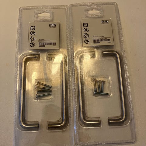 27 styks , prisen er alle sammen , og sælges kun samlet . IKEA TRANSITIV greb i metal med kromfinish. Centerafstand 107,5 mm. Velegnet som skuffe- eller lågegreb til møbler og køkkenelementer. Leveres oprindeligt med skruer til montering i træ.