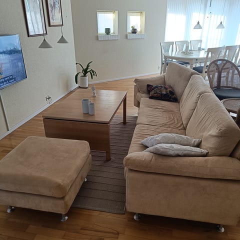 Der har været hund i hjemmet, så sofaen har brugsspor og vil have godt af en grundig rengøring, evt. med tæpperenser. Udover dette fejler den ingenting og har ingen større skader.