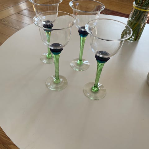 Viggo Haaning, mundblæst glas med en dekorativ stilk. Glassene har et grønligt skær.