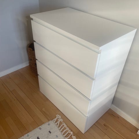 IKEA Malm kommode i hvid med 3 skuffer. Kommoden er velegnet til opbevaring i soveværelse, entré eller børneværelse. Den har en glat, hvid overflade og en enkel, rektangulær form, der gør den nem at placere op ad en væg. Skufferne giver god plads til tøj, tekstiler eller andre mindre genstande.