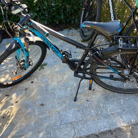 Mountainbike med sort og blå ramme, robust konstruktion og slidstærke dæk til offroad-kørsel. Skivebremser..lås med nøgle