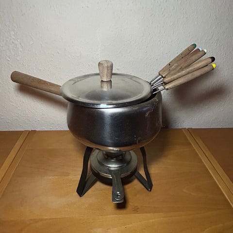 Brun keramik fonduegryde med stålskål og tilbehør bestående af 6 fonduegafler og varmer.- Bemærk at mail, chat og beskeder ikke besvares, og varen skal købes på knappen "Gå til varen". Efter reservering af varen har du 10 dage til at afhente den i den butik, varen er på lager i.