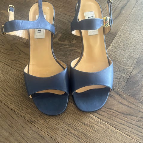 Billi Bi højhælede sko i størrelse 37. Skoene er åbne foran med brede, krydsede remme over foden. Farven er navy/blå, og overdelen har en glat, let skinnende overflade. Hælen er bred blokhæl, som giver stabilitet. Indvendig sål er i mørkt materiale med Billi Bi-logo. Velegnet som pæne sko til hverdag eller festlige lejligheder.
