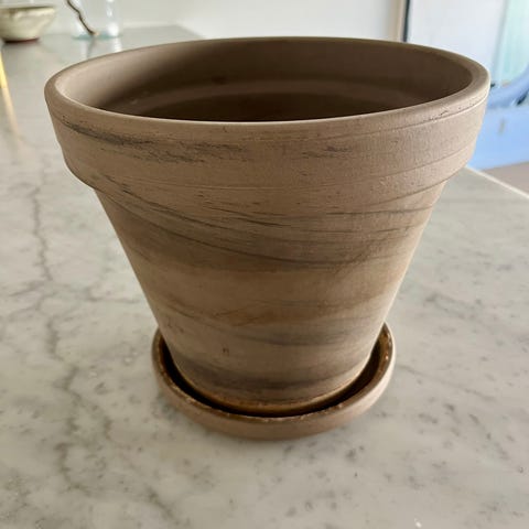 Krukke i en mørkegrå nuance. Krukken har en klassisk, konisk form med en let udadvendt kant foroven. Den har et drænhul i bunden.
