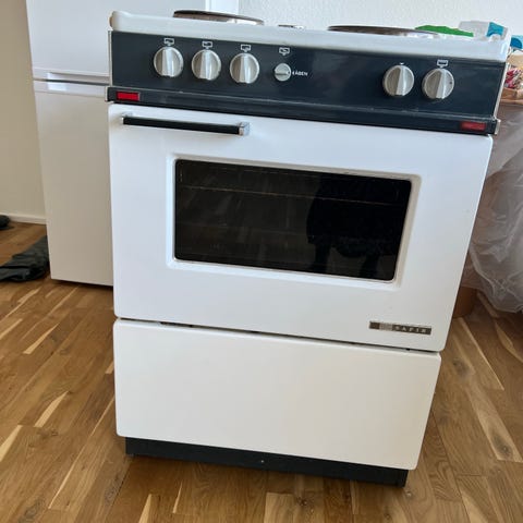 Komfur med ovn bortgives, fungere fint. Håndtaget til ovn knækket af, men kan fortsat åbne og lukkede. BORT GIVES, dårlige billeder fordi det står i skur
