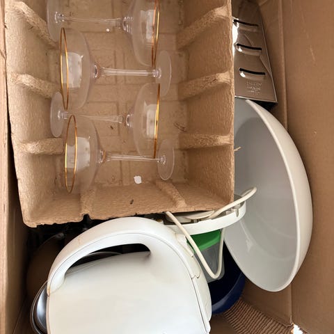“flytte hjemmefra kasse” med diverse ting til køkken.