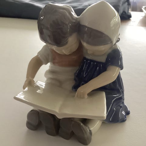 Bing & Grøndahl figur i porcelæn, der forestiller to børn, som sidder sammen og læser i en bog. Pigen er iført blå kjole og hvid kyse, drengen lyse tøjnuancer. Figuren er glaseret og udført i lyse, afdæmpede farver. Undersiden har Bing & Grøndahl stempel og filtdupper til beskyttelse af underlaget. Velegnet som dekoration i stue, reol eller vitrineskab.