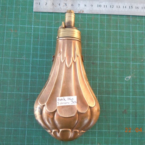 Krudtflaske i kobber med prægede dyremotiver på begge sider. Tilskrevet Remington. Udstyret med skrå metalstuds til .44 kaliber revolver o.l. og lukkeanordning i toppen samt små øjer i siderne til fastgørelse. Velegnet som samlerobjekt eller rekvisit for sortkrudtskytter, f.eks. til jagt- eller våbenhistoriske miljøer.