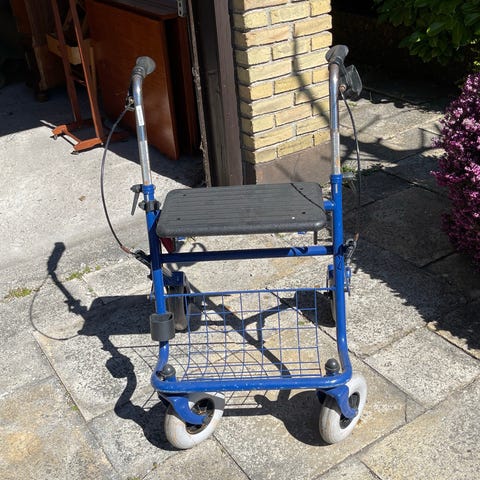 Rollator med fire hjul, håndbremser, sæde og lille kurv under sædet. Egnet til støtte ved gang både inde og ude. Højden på håndtagene kan typisk justeres, så brugeren kan tilpasse den til egen højde. Sædet giver mulighed for korte pauser undervejs. Rollatoren har mindre forhjul, der gør den manøvredygtig på jævne underlag som fliser og indendørs gulve.