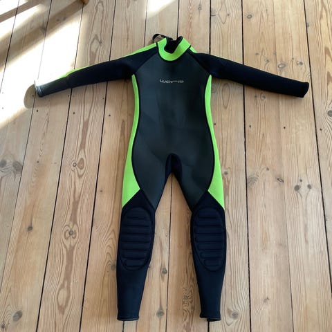 Af neopren med lange ærmer og ben. Lynlås i ryggen med forlængerbånd for lettere at kunne tage dragten af og på. Nøglelomme inde i dragten og med velcrolukning i nakken. Tykkelse: Bryst 3 mm. Ryg, skuldre, ærmer og ben 2 mm.