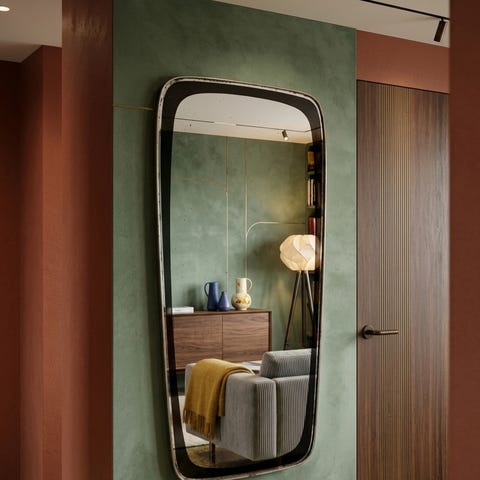 Sjældent, asymmetrisk spejl fra 1950'erne/60'erne. Smuk, organisk form med den helt rette originale patina på ramme og glas. Et flot stykke tysk design.