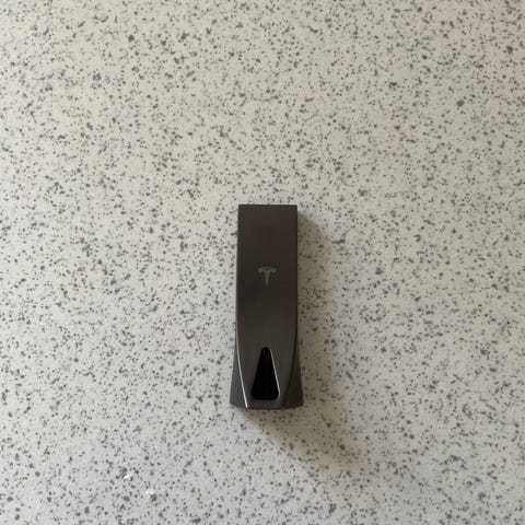 Original Tesla USB-stick. Tesla-logo på forsiden. Velegnet til lagring af videooptagelser fra Teslaens system.