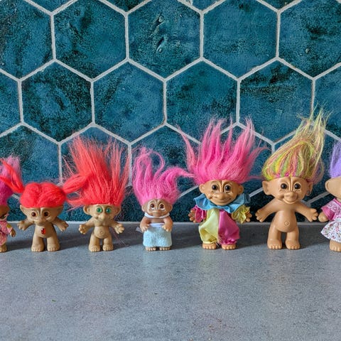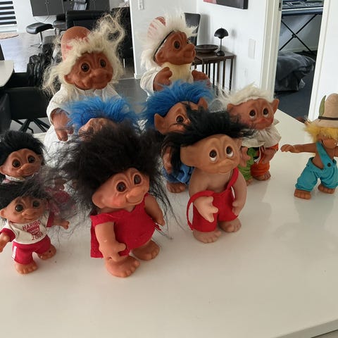 Troldepar af Thomas Dam 1977. Dam Troldepar made in Denmark. Sættet består af to klassiske troldefigurer i gummi/plast med påsyet tøj. Den ene dukke er klædt i hvid kjole med blonder og briller, den anden i mørkt jakkesæt med butterfly. Begge har påstøbt mærkning under fødderne med "Made in Denmark" og nummeret 604. Egnet som samlerobjekter eller pynt.