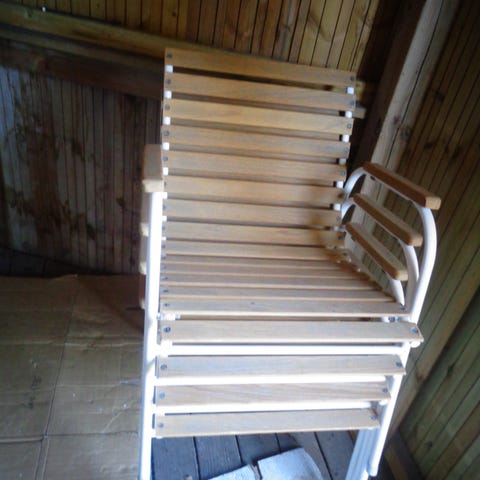 Havesæt bestående af rektangulært havebord og fem matchende stole i hvidmalet træ. Bord og stole er udført med lameller og krydsben. Stolene har armlæn og høj ryg samt sammenklappeligt stel, så de kan foldes sammen ved opbevaring. Sættet er egnet til udendørs brug på terrasse, altan eller i have. Mærket er Jutlandia. Bordet trænger til maling og enkelte stole