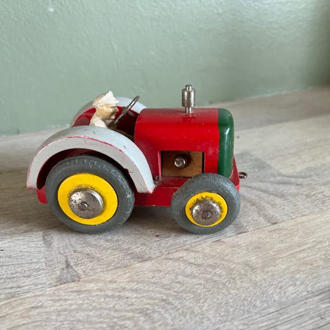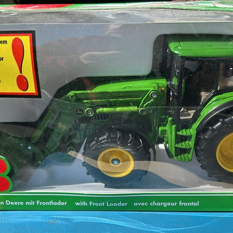 Legetøj gødningsspreder til modeltraktor. Redskabet er udført i plast med gul tragt og rød ramme samt to sorte hjul med gule fælge. Velegnet som tilbehør til landbrugslegetøj og modeltraktorer i mindre skala. Kan bruges til leg eller som samlerobjekt i en landbrugsmodelopstilling.