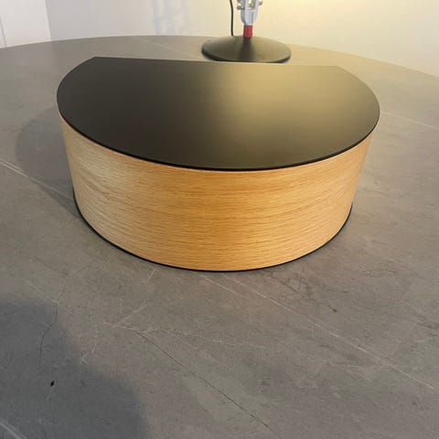 Sidebord i sortlakeret metal med rektangulær form og åbent rum under bordpladen til opbevaring. Bordet har afrundede hjørner og en rund detalje i kontrastfarve på bordpladen. Egnet som sengebord, sofabord eller lille opbevaringsbord i stue, soveværelse eller entré.