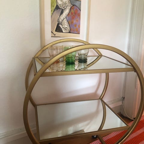 Sælger det her lækre barbord i guldlook med glas og på hjul