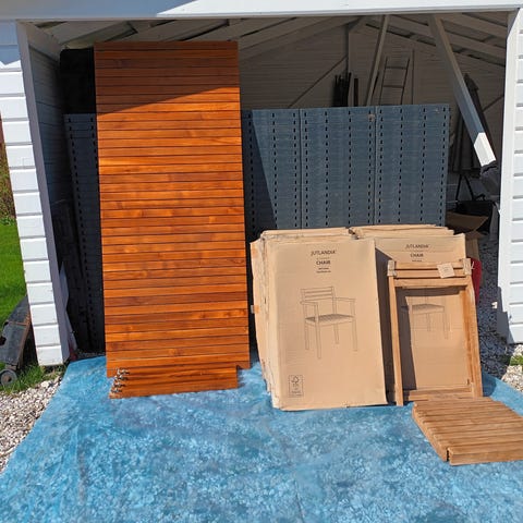 Havemøbler i teaktræ 140x90. Det hele kan slåes sammen. Det trænger til olie. Afhentes i Ikast eller Skive
