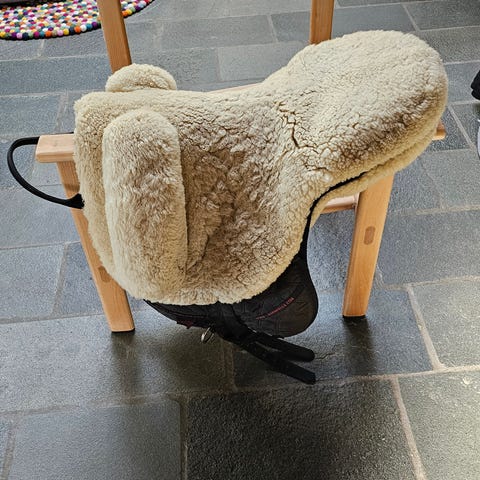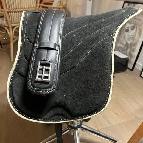 Christ ibirica Lammeskind bomløs ridesadel i naturfarvet lammeskind med sort underside og gjordstropper. Sadel uden fast bom, der former sig efter hestens ryg. Udstyret med flere gjordhuller til justering samt ringe til fastgørelse af evt. tilbehør. Velegnet til ridning, hvor der ønskes tæt kontakt til hesten og blød siddekomfort. Str pony (stor i str synes vi) evt bøjler på sidste foto kan medfølge hvis ønsket.